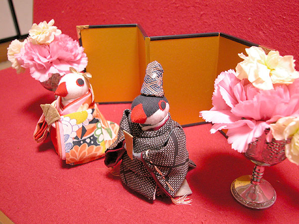 男雛さまが桜文鳥さん、女雛さまが白文鳥さんです。