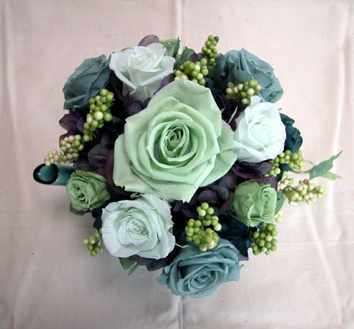 ミストグリーンのローズとシックな色のアジサイの組み合わせで