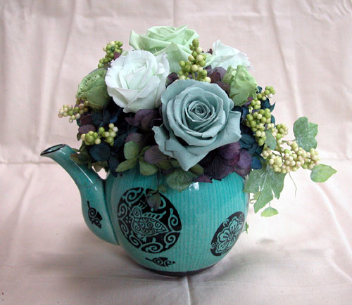 お気に入りの中華風ティーポットを花器に使用しました。